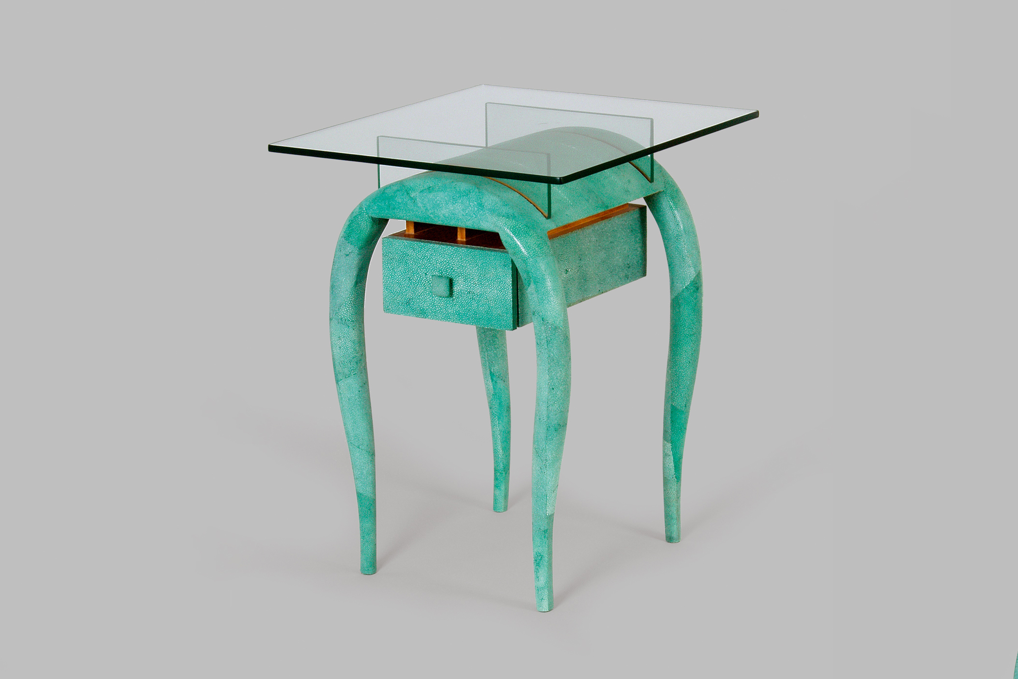 In der Sammlungspräsentation LEDER.WELT.GESCHICHTE. rückt die wissenschaftliche Mitarbeiterin Leonie Wiegand M.A. die Materialität der Exponate in den Mittelpunkt. So sind neben gängigen Lederarten auch Objekte aus Pythonhaut, Lachsleder und Rentierpelz zu sehen. Im Ausstellungsprojekt DEIN MUSEUM. Sammlung neu gesehen beeindruckt ein Beistelltisch des Designduos Ria und Yiouri Augousti aus dem Jahr 1994 mit türkis eingefärbtem Rochenleder, auch Galuchat genannt.